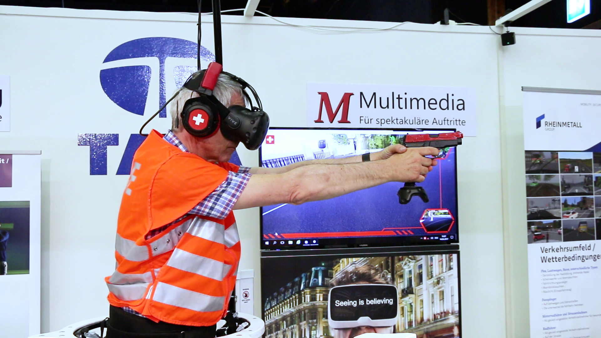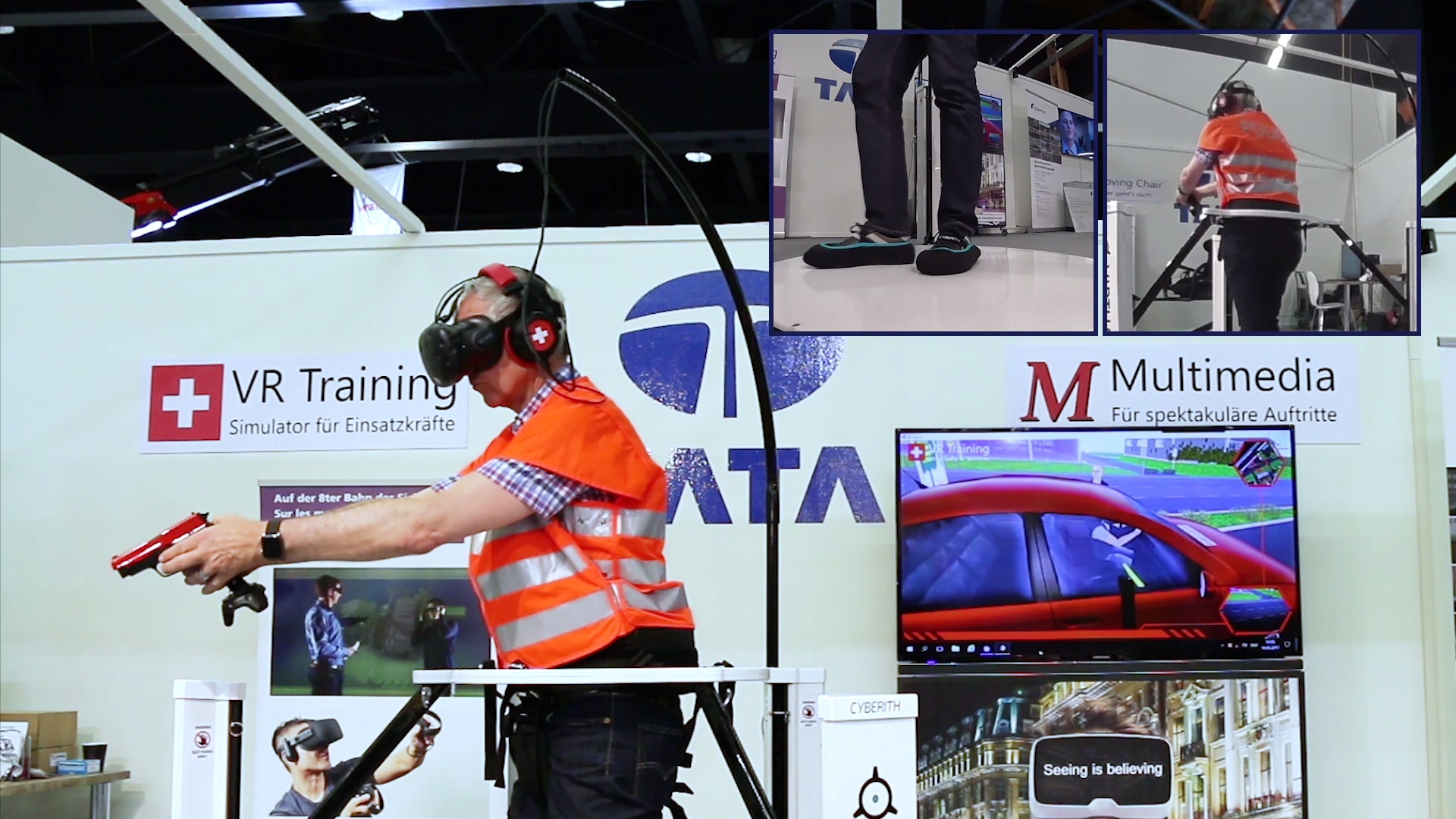 Thanks to the latest technology from the Swiss multimedia producer TATA Interactive Systems individuals as well as entire groups can now train location-independent operational scenarios. With the VR trainer, the user is immersed in a complete, realistic computer world with people, moving cars and true-to-life details.