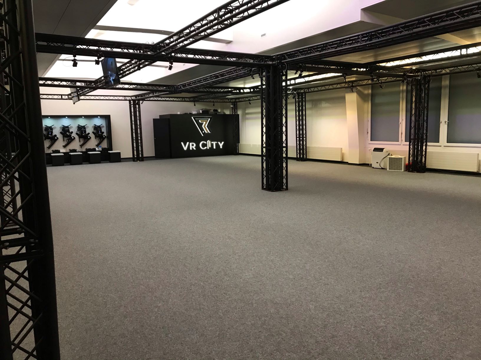 The first impression inside was already very good: a spacious, bright hall with a small and a large VR arena, 2 racing simulators, a bar and two grandstands awaited us. Contrary to expectations, there was still a lot of activity after 8.00 pm. Michael Köchler, the owner, greeted us straight away and directed us to the cloakroom; he would be with us shortly. We gladly got rid of our jackets, as it was quite warm in the hall and anyone who has ever worn VR glasses and moved around with them knows that it doesn't get any cooler.