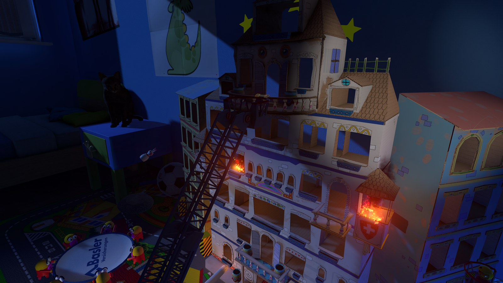 Dans l'application VR haut de gamme, le joueur se trouve d'abord, après un bref enregistrement via un iPad, dans une chambre d'enfant typique. Sur une table de nuit se trouvent une bougie et, juste à côté, un chat. Après que le joueur a regardé autour de lui dans le monde virtuel à 360 degrés, tout s'accélère : le chat renverse la bougie et la maison de poupées en carton située à côté prend feu. Le joueur voit et entend les camions de pompiers arriver en trombe et rétrécit lui-même pour devenir une figurine miniature. Sa tâche consiste alors à éteindre le plus grand nombre possible de sources d'incendie en se trouvant sur une nacelle élévatrice et, en échange de points bonus, à arroser quelques fleurs. Pour ce faire, le visiteur du salon est équipé d'une lance à incendie, comme dans le monde réel, de sorte qu'il a également l'impression haptique d'être en action.
