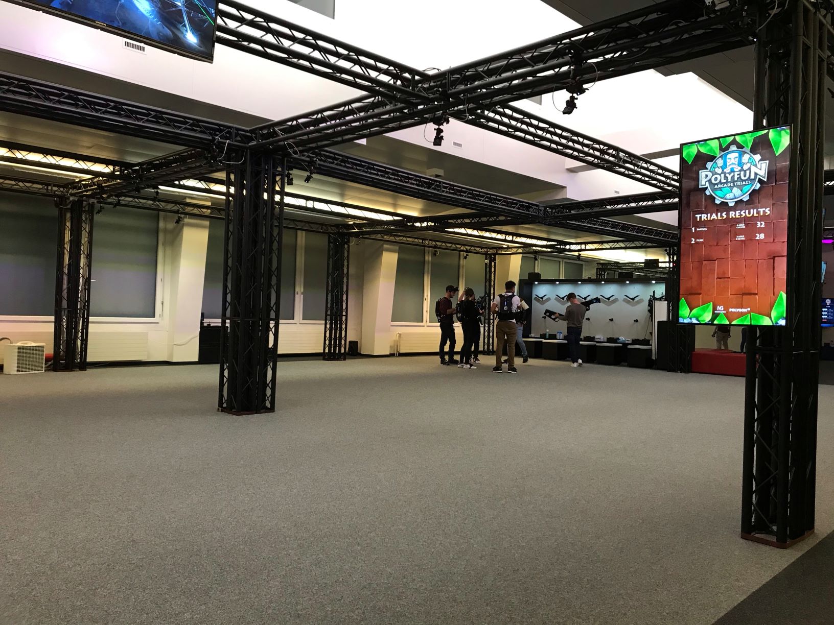 Pendant ce temps, Michael a accueilli un autre groupe qui s'amusait avec un VR Party Game. Grâce aux écrans, nous pouvions non seulement les observer en vrai, mais aussi voir ce qu'ils étaient en train de vivre dans la VR : Danser, esquiver, courir sur des dalles qui tombent et ainsi de suite. Le jeu semblait vraiment amusant.