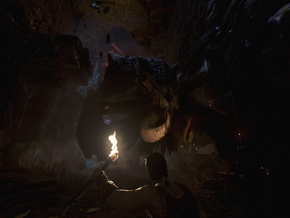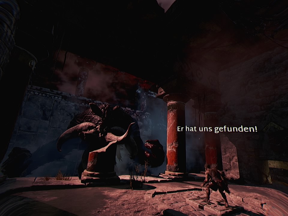 Sfuggi al terrificante Minotauro! Teseo, il nostro eroe della mitologia greca, combatte un po' come Kratos di "God of War" nell'omonima avventura action-horror. La sensazione di VR? A volte è la visuale in terza persona di "Edge of Nowhere", a volte la prospettiva a livello fisso di "Chronos" - ma non funziona ovunque. È necessario?