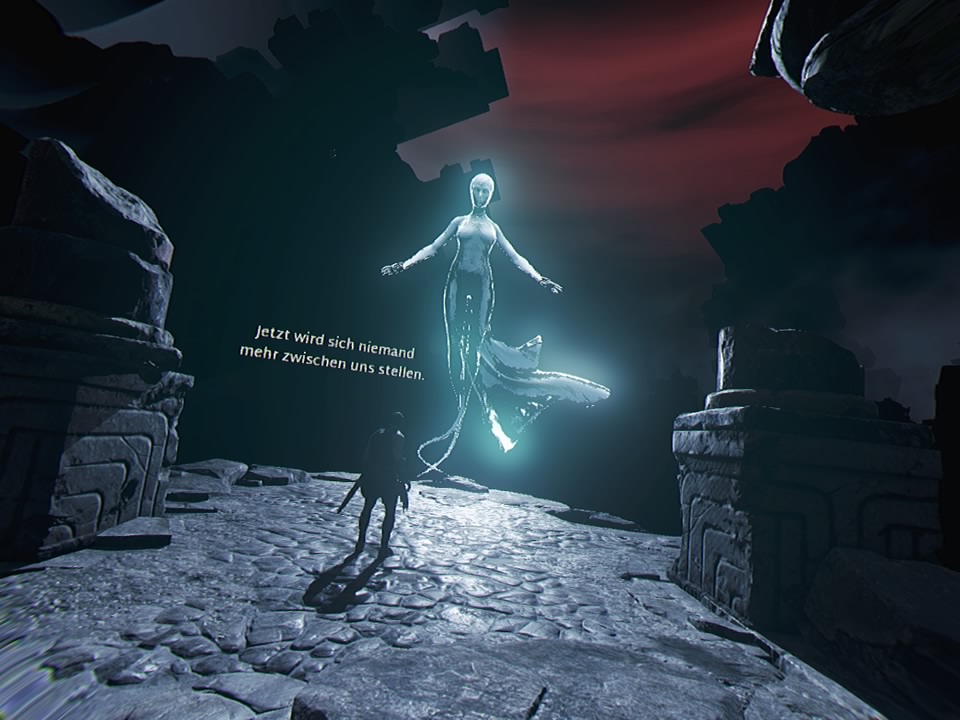 Penso che l'immersione sarebbe stata migliore se tutto fosse stato risolto coerentemente in terza persona, perché non ci sono molti enigmi o interruttori nascosti da esplorare. Per passare da una stanza all'altra, di solito bisogna premere un interruttore in modo che la dea possa accecare l'avversario con i suoi raggi di luce. Questa sensazione di non-VR a volte si manifesta anche quando si pugnalano con la spada i fastidiosi polipi che costituiscono una folla perenne di nemici o li si acceca con la torcia in battaglie piuttosto lunghe. Il sistema di combattimento è costituito solo da fendenti di spada, rotolamenti di picca e corsa veloce. Purtroppo il rilevamento delle collisioni è un po' lento. I cosiddetti "Quick Time Events" (QTE) non erano necessari per peggiorare la situazione. Nei panni di un signore della guerra intrappolato, un lungo tocco per liberarsi può persino far venire i crampi ai pollici. Anche un po' noioso: Nel corso del gioco, dovrete spesso arrampicarvi su per le pareti delle valli, come accade in altri giochi come "Uncharted" o Rise of Tomb Raider! L'intero gioco ha una struttura piuttosto lineare. Nella maggior parte dei casi, solo gli eventi critici per il tempo devono essere cronometrati correttamente. Inoltre, non ci sono lunghi labirinti da percorrere.