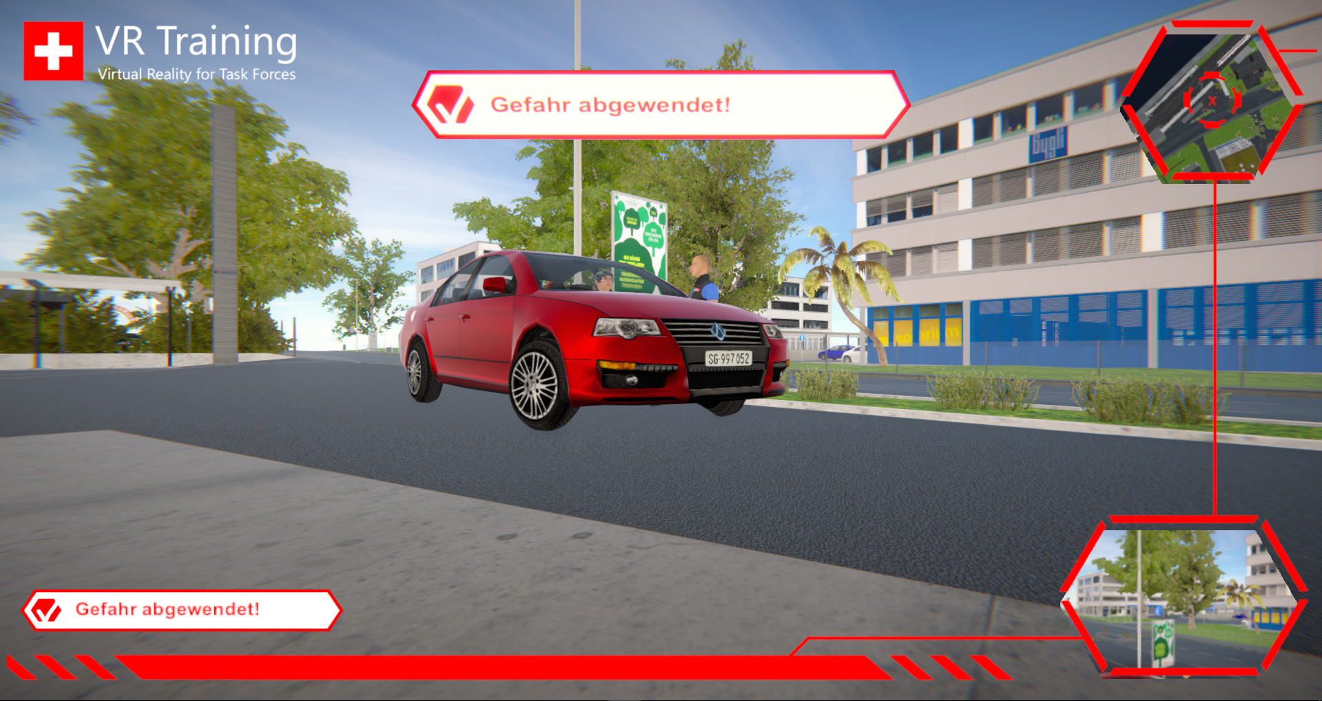 Grazie alla tecnologia di ultima generazione del produttore multimediale svizzero Sistemi interattivi TATA Sia singoli che interi gruppi possono ora addestrarsi a scenari operativi indipendenti dal luogo in cui si trovano. Con il trainer VR, l'utente è immerso in un mondo computerizzato completo e realistico, con persone, auto in movimento e dettagli reali.