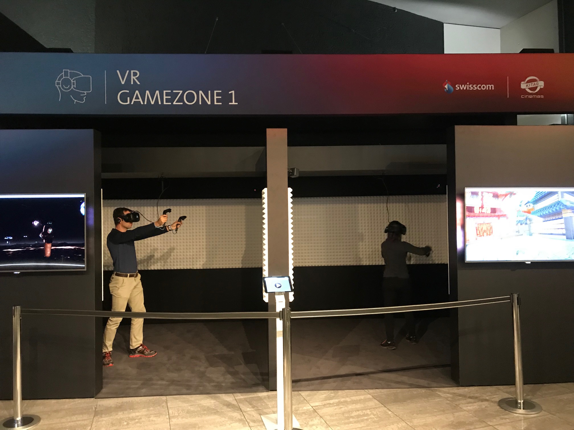 In ogni caso, i due supervisori avevano il loro bel da fare: Da un lato, dovevano spiegare agli altri visitatori come funziona il tutto, dall'altro erano costantemente a disposizione per darci consigli, districare il cavo che col tempo si era attorcigliato e pendeva dal soffitto, o cambiare il gioco per noi. Un buon servizio che garantisce il divertimento.